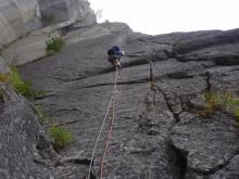 3P目 ボルトラダ-を直上しハング下を左へ、カンテ状を越え草付の安定したテラスへ。