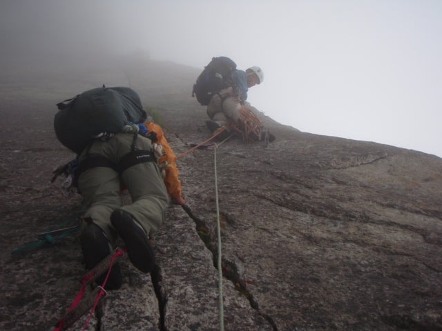 2P目 フリーの核心(5級クラック30m)田口さんが20年ぶりの登攀と思わせないダイナミックなクライミングを見せる。
