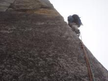 田口さんがクラック沿いにA1で直上して行くが、ピンとピンの間が遠く途中にナッツ・フレンズをセットしながらの人工登攀が続く。