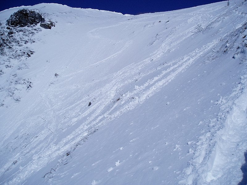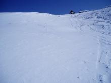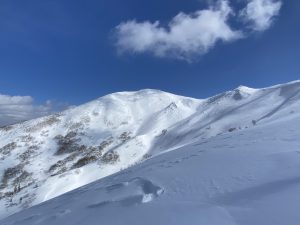 どこも所どころ岩や灌木が出ていて滑るのは厳しそうだが、頂上直下のルンゼはすこし滑れそうかな~という感じ。