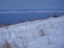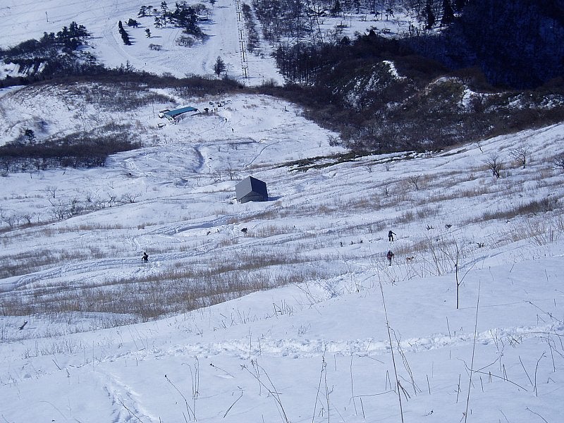 山頂で本を読んだり、ご飯を食べたりしてゆっくりした後、南面はダメっぽいので北面を偵察に行く。伊吹山ドライブウェの西側が短そうだけど十分な雪はあるように見える。ここを滑ってみる。北面だけあってやっぱり雪はフカフカ。1本滑って登り返し、もう1本滑った。南面が駄目だった時は、北面でちょろちょろっとは滑れるかも。それにしてもパウダーを滑るのは難しいなー。ゲレンデと全然違うや。