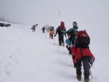 2008.05 富士山 2008 5/17 雪 歩き 山スキー 2008.05.17-18 富士山スキー・登山(須走り口) メンバー:吉田か・谷岡・柳瀬・松村・照ピ・吉田ゆ・松田・横田・岩田 (会外)古倉・岡本 今年は残雪が多いので、須走り口へ行くことにした。吉田大沢に比べて、スタート地点の標高が高いので楽であった。しかし、その分登山者(特にボーダー)が多い。 駐車場より見上げる、やはり今年は雪が多い。 須走り口は人が多すぎる。 頂上までもう一息。 頂上、鳥居前で記念写真。 歩き隊の下降(新人をサポート) 岡本の華麗なテレマーク。 ミニスキーで滑るヤナピー。 大雨でも平気な東屋のおかげで快適な宴会ができました。 雪 歩き 山スキー フリークライミング 2008.05 白馬岳 春山合宿 大峰 上多古川 矢納谷遡行 関連記事 五色ヶ原~薬師岳 2025年7月31日 雲の平 2025年7月22日 白山 2025年7月11日 剣山~次郎笈 2025年6月27日 中央アルプス サギダル尾根 2025年3月22日 銀杏峯 2025年1月12日 常念岳東尾根 2025年1月11日 荒島岳 2024年11月8日