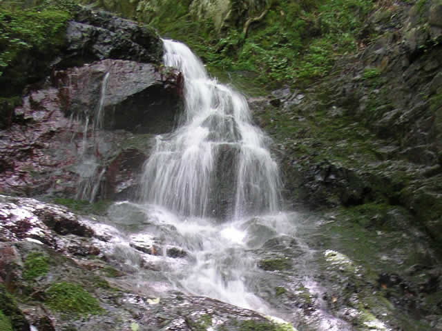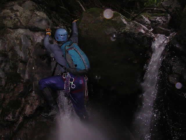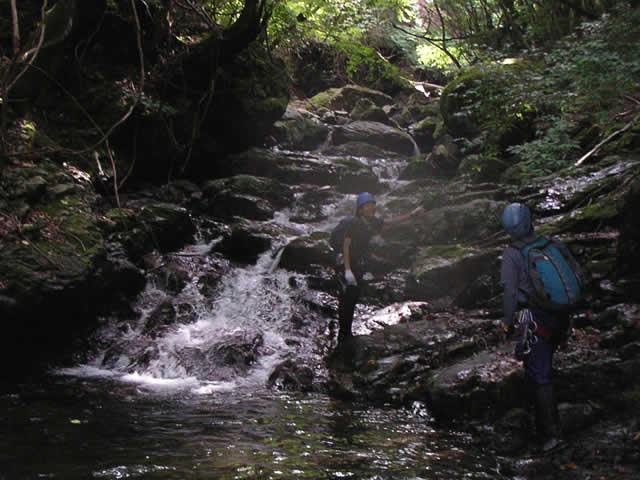 時折、腰までつかるほどの釜を登る。やがて右岸の植林小屋に出会い、本流の遡行を打ち切る。ここから沢を下り、行者還岳からの枝沢に入る。滝が連続して本流より おもしろそうだ。