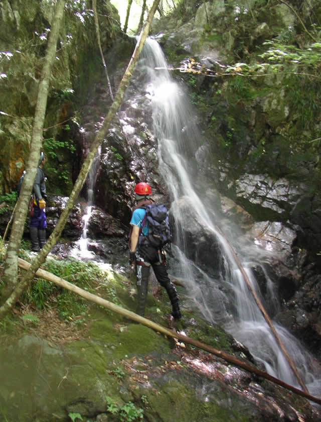 8m滝は吉田のリードで登る。次の10m滝は右岸を大きく巻く。