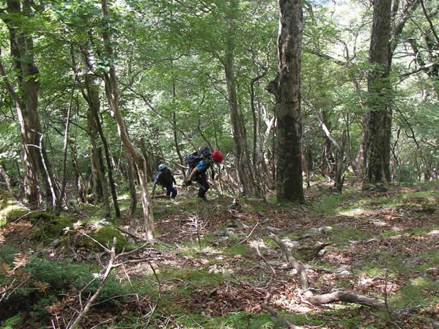 沢に戻ってしばらくすると、伏流になってしまった。ここで遡行を打ち切り 沢を詰めて行者還岳への稜線を目指す。沢筋がガラガラになってきた所で尾根に移るが、ここも蟻地獄のようで登りにくい。悪戦苦闘の末、やっと稜線に抜けた。