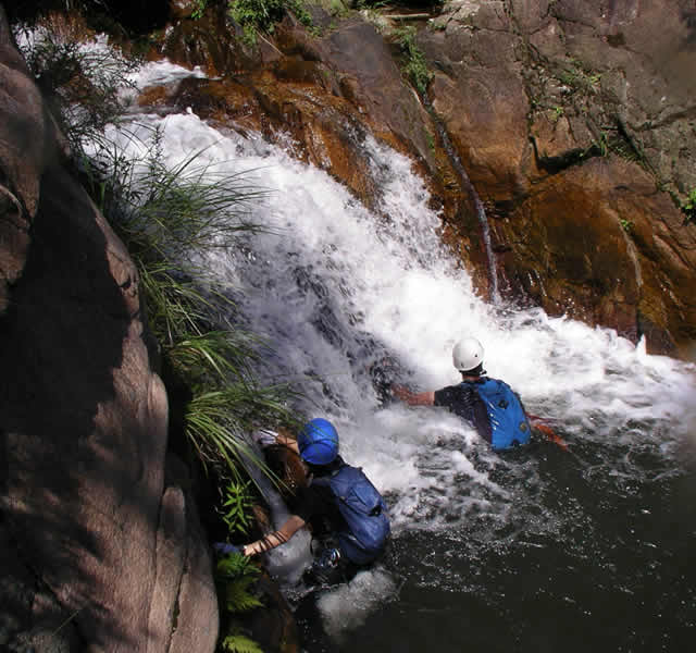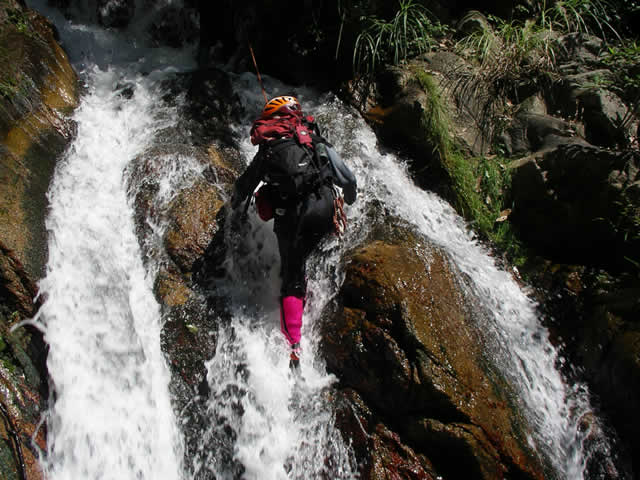 5m斜瀑を越え、堰堤を右側から巻く。少し歩くと大きな釜を持った浮華の滝に至る。ここは岩田が二条の滝の間をリードする。後続はロープで確保して一人ずつ登る。滝を抜けてからも ミニゴルジュや小滝を快調に登ると最大の難所、芦屋大滝に出合う。