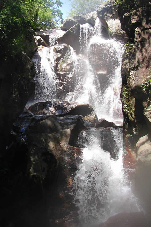 水量と高度感に圧倒される。修行僧よろしく滝に打たれる様子を記念撮影の後、右岸側を高巻き、いったん道路に出る。再度沢身に戻って小滝、淵を楽しむ。