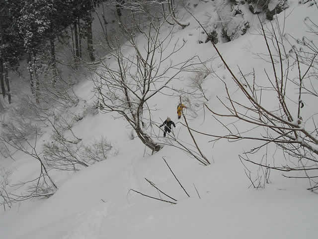 ラッセルを交代しながら鉄塔の最高点に到着。一休みの後、伐採斜面へ滑降開始。吉田、松田はフカフカながらもやや湿った雪に足をとられ、時折転がる。750m台地まで滑り、時間があるので登り返す。