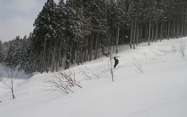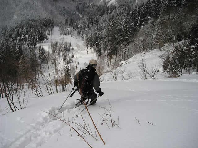 鉄塔最高点から再度シールをはがして滑降開始。750m台地を少し登り、緑の村へ向かう。薮を避けながら林道に出合う。林道を漕ぎながら緑の村に到着。少雪でも楽しめる貴重なコースだ。