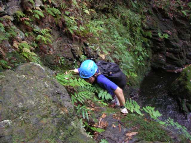 高山寺駐車場から国道162号線を毘沙門橋まで歩く。準備を整えて入渓。 ところが最初の4m滝の巻き道がわからない。山腹を巻き、ロープに頼って下りる。しばらくはゴーロが続く。5m滝の手前で小休止。5m滝はホールドが豊富でシャワークライミングを楽しむ。