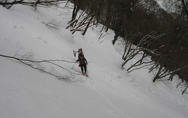 小休止の後、西又谷方向へ滑降開始。滑り出しは樹林が邪魔だが、やがて疎らになり、重パウ ダーを楽しむ。800mほどまで滑り、稜線に登り返す。