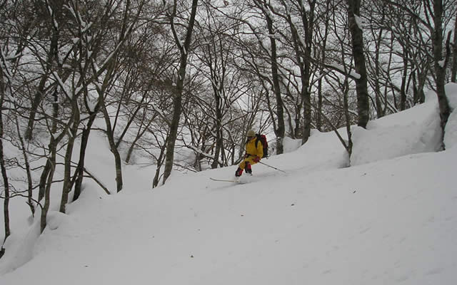 稜線からはスキー場方面へ滑り出す。こちらも疎林の快適な滑りだ。中腹では無木立の大斜面になる。後半は沢筋に入り込んでしまい、 ところどころデブリも出ている。悪戦苦闘の末、堰堤に至る。ここ からは林道を滑ってスキー場に到着。