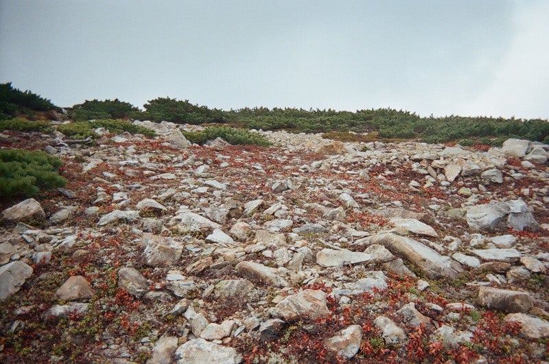 て朝っぱらから汗かいてます汗しばらくすると積雪期だったらテン場になりそうな平地があちこちにあります。砂払いも平地です。ここが森林限界で後は適当にハイ松漕いでボーコン沢の頭まですぐです。城峰・ボーコン沢の頭間は積雪期でのテン場はあちこちにありました。