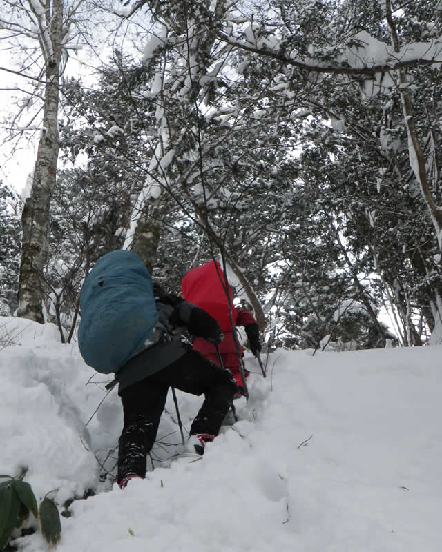 9:07 取り付き地点(1435m)に到着。ここからは、トレースがない。わかんを装着し、樹林帯に入って行く。雪は膝下程度であり、そう深くはないが傾斜はそれなりにあり。