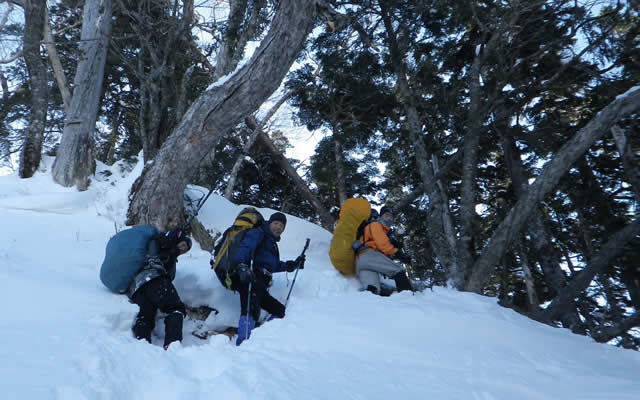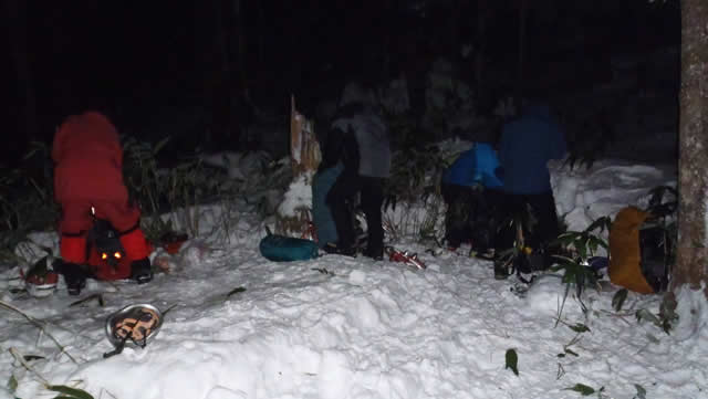 14:50 2030m地点に到着。2万5千分の1の地図では、平らになっている地点。次の平らになっている地点まで登るのは、時間的に足らないことから、この場所にて幕営することを決定。テントサイト作りを行う。全員でスコップで