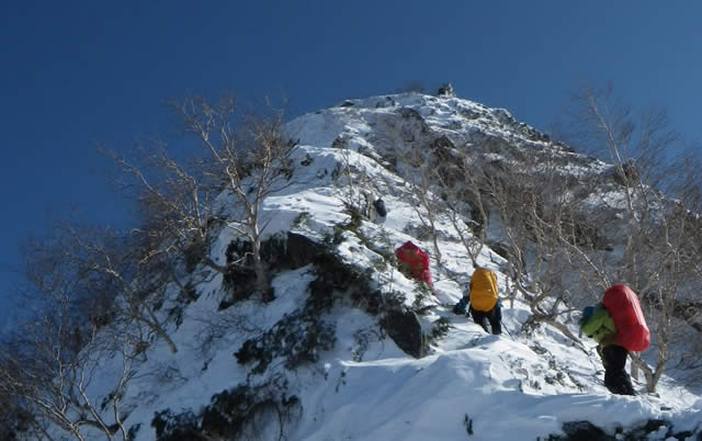 7:15 テントを撤収し、アイゼンを装着して出発。時折、岩稜地帯があり、慎重に進む。山頂直下では、フィックスロープが張られており、時折掴みながら登る。