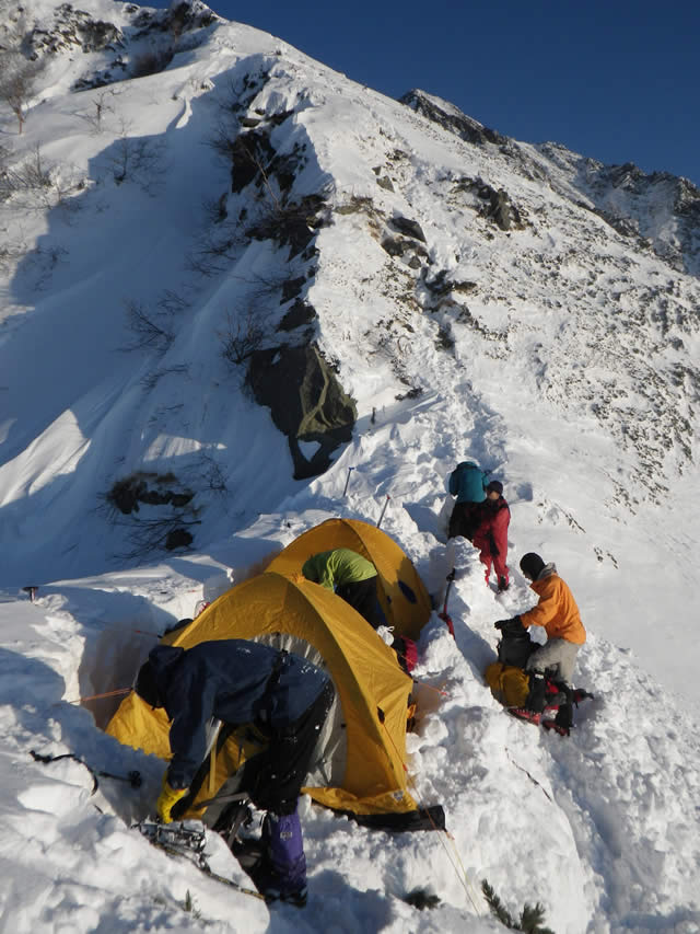 15:00 2735mのジャンクションピークに到着。蛍雪山岳同志会の方と合流し挨拶を行う。幕営最適箇所を探し、少し下がった鞍部が最適であると判断。テントサイト作りを行う。雪庇の張り出しがないとの判断のことから、テントサイトを拡張する。ブロックの積み上げもでき、快適なサイトを作成することができた。