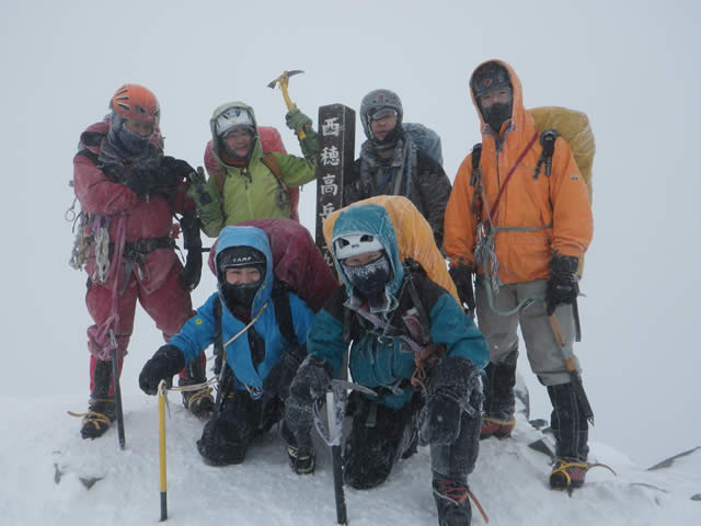9:05 山頂に到着。雪が降っており、景色は見えない。関東勢が、少し遅れて到着。標識の前で記念撮影を行い、早々に下山を行う。