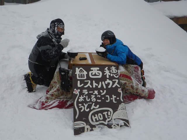 11:50 西穂山荘に到着。アイゼンをはずし、山荘の前の巨大雪だるまやコタツの前で記念撮影。