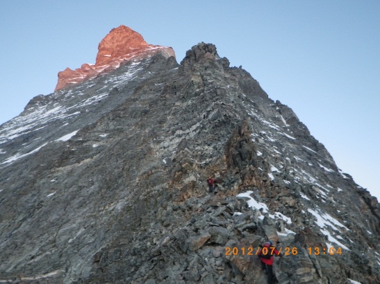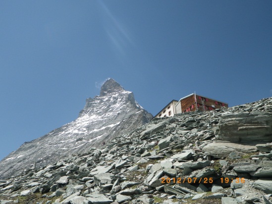 岩田しは24才の時に一度登頂しているが、再度あの頂上に、また相棒の岩田まにも登ってもらいたくて計画してみた。昔の記憶では下部岸壁は少し迷ったがそれ以外に大きく迷った記憶がなく、下降も頂上からヘルンリヒュッテまで4時間ぐらいで降りたと思う(懸垂下降以外はソロのクライムダウン)。岩田まには「簡単やから行ける、行ける」と話して、山に向かったがその記憶は36年前のこと、実際とはえらい違いがあり我々は約4200mで退却を余儀なくされた。下降開始はAM10時20分と、ちと早い気もしたが上に進んでもFIXロープでのすれ違い(登頂パーテイが下山してくる)による渋滞で、登頂時間は大幅に遅くなることを考え下降することにした。しかしこの下降が正解?で、ヘルンリヒュッテに辿り着いたのが18時、この日の最後のパーテイが我々であった。こちらではソルヴェイヒュッテまで3時間で到達しなければならないという基準がある、この3時間という理由だが、体力・技術的な問題もあるが、上部岩壁帯のFIXロープで登下降者が鉢合わせになり渋滞を起こす理由にもなるので、それを避けるための時間かなとも思う。登ってみてまずガイド登山とガイドレス登山との違いに大きな戸惑いを感じた。 一番の違いはスピード。ガイドはその強靭な体力で簡単な岩場であればコンテでどんどん登って行く。下降はゲストをロワーダウンで先に降ろし、自分は素早くクライミングダウンする方法を使っていた。スタッカットとラッペリングの回数が我々とでは大きな違いがあり、その差がスピードの違いに大きくあらわれたと思う。コンテもガイドはループを手に持った従来からの方法でゲストのスリップを止めていたが、岩田しはその方法では自信は無いので大阪方式を使用した。大阪方式は非常に有効であったがループ方式(仮称)と比べるとどうしても時間は掛かってしまう。しかし安全を優先して慣れている方法を使った。それと前のパーテイに追い付いたら、同じ支点を使ってでも横を追い越して行く厚かましさ?も必要である。マッターホルンを登るには技術的に難しい箇所は無いので、体力とそれなりの登攀技術(登るだけではなく、下降技術の方が大事)がありコンテを安全に使え、追い越しの要領がわかればガイドと同じように登れると思う・・・ただしルートに迷わなければ。