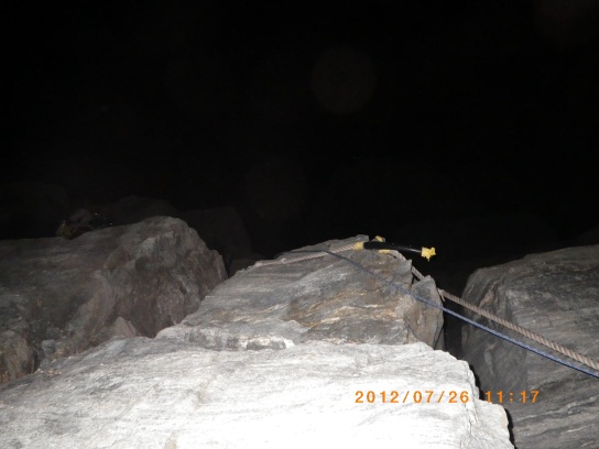 固定ロープがある岩場からヘッドランプを点けて登攀開始する