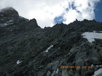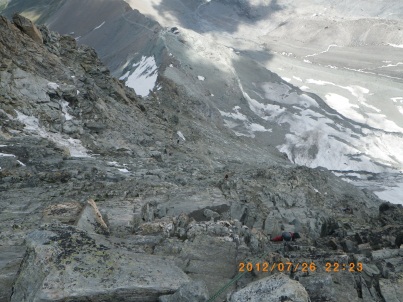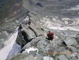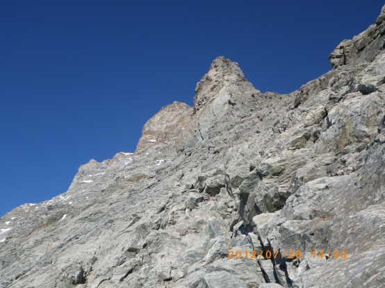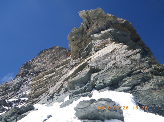 モズレイスラブは容易(3級)であるがやや本格的な登攀、ランニングを取りながら登るとソルヴェイヒュッテに着く。ホッと一息付ける場所であるがゆっくりしている場合ではない、アイゼンをつけて左手の壁を登る。しかし登頂を終えたパーテイがどんどん降りて来て、FIXロープの箇所で鉢合わせ、日仏友好協定?で譲っていたら一歩も登れないので強引に登るも下山パーテイは多く登攀スピードは遅くなる一方である。すれ違うガイドは降りるように勧める。時間は10時20分、頂上までは後2時間ぐらいか・・・?