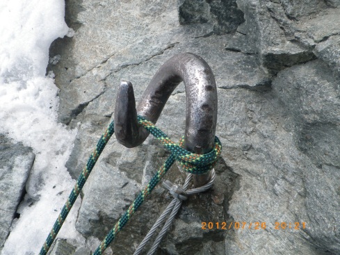鉄棒にロープを巻きつけてロワーダウンする モズレースラブのラッペリング ヘルンリヒュッテがやっと見えて来たが、いつの間にかガイドパーテイは先に降りてしまい、またドイツ人パーテイと我々だけになってしまった。 最後まで気を抜かないように「集中!」と、岩田まと気合を入れ合いながら下降する。