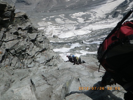 下山するには日本流では早い時間であるが、下降での道迷いは必至?であろうと考え下山することに決める。(ガイドパーテイの後について行けば迷うことも無いであろうと、安易な考えもあった)下降を始めるが、ここでもどんどん抜かされる。我々がスタッカットで確保しながら降りている所を、ロワーダウンでゲストを降ろしガイドはササッとクライムダウンして行く。我々もその方法で降りるも技術、慣れの違いかスピードが違う。