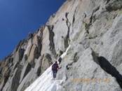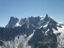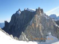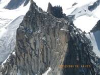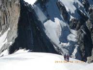 ジュアン、グランドジョラスの景色が素晴らしかった。記念写真を撮り下山開始。懸垂で荷をデポしているところまで下降。荷を背負い早々に下山開始するが、野木-和田のピッチがあがらない。Rognonn岩稜の登り返し、まずは岩田氏がとりつき登るがかなり厳しそうな登り。時間のこと、野木が登れる技術が・・とのこともあり、岩田しがロープをフィックスし3名続いて登る。野木-和田のペースでは確実にロープウェイ最終時間に間にあわないため、岩田し-岩田まには先に下山してもらうようお願いする。