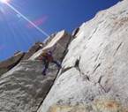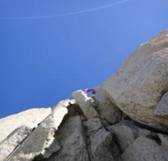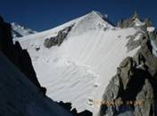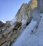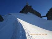 8時15分、トンネル出口を出て出発。まずは、細い雪稜を慎重に下る。多くのガイド付き登攀者が歩いているが、皆ミディのコルを目指し雪面を降りていく。プランを目指し、私たちは稜線上をトレースたどりながら進み、しばらくして急な雪壁を下降、途中懸垂支点があり先行パーティが懸垂をしていた。雪壁途中、大きなクレパスがあるようで、私たちも支点を使い、互いのロープをほどき50mの懸垂下降を行う。