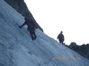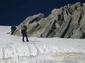 その後、登り返し稜線にそって歩くのだがカリカリに凍った雪壁のトラバースが続き神経を使う。岩田し-岩田まは順調に歩いているのだが、野木-和田パーティはビレーしながらトラバース行うため、かなり遅れをとってしまう。トラバースを終えると、広い雪原にあがり次にrognonn岩稜の下降となる。懸垂支点らしきものがあるのだが、ルートがよくわからず時間をとってしまう。2度の懸垂で氷河上に出てプランのコルに13時過ぎに到着する。