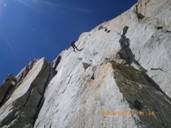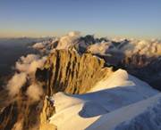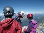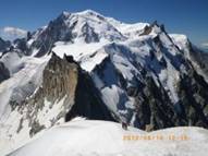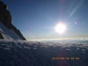 5時起床、6時にアパートメント出発しロープウェイ乗り場へ向かう。乗り場には、すでに多くのクライマーと観光客が並んでおり始発には乗れず7時半ごろに乗車する。Midi山頂駅で登攀準備、岩田し-岩田ま、野木-和田のペアで、コンテでロープを組む。岩田し-岩田まは、ネパールから始まりマッターホルンやモンテローザなどに行かれているため、ロープワークが早い。山頂駅からの景色は最高で、グランジョラス、マッターホルン、モンテローザなど見える。