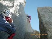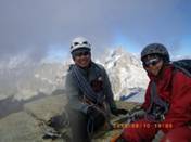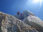 私たちは、岩場の基部に荷をデポし、岩田し-岩田まは岩の右側から、野木-和田は正面の岩場からとりつく。追いついてきた2名は左寄りの岩場から登りはじめ、抜かされてしまう。正解は、左寄りからの登りのようだ。もたもた登っている間に、外人2名は山頂に立ち喜びの声をあげている。その後、野木が続く予定が、最後の一段の高い岩が乗り越せない。岩田しが、交代で軽々と岩を乗り越し山頂へ上がる。その後、野木を引き上げてもらうつもりが体が重くあがらない。下降開始していた外人がお尻を押し上げてくれて、何とか野木も山頂に立つことができた。続いて二人も登り無事4名14時半に山頂に立つことができた。