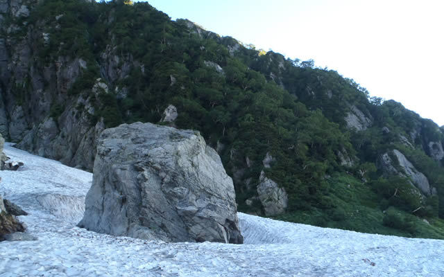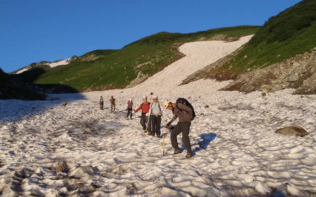 とりあえず朝は晴れている。予定を変更して八ツ峰へと向かうホリケンさんパーティと一緒に出発し、剱沢雪渓を下る。