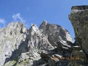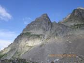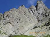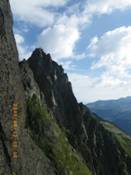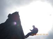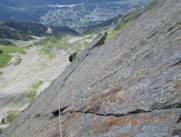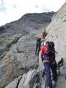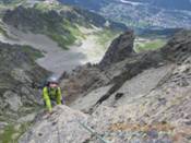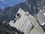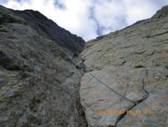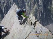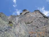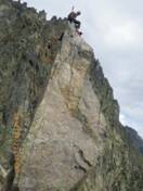 後は容易な岩稜の登攀(3級)となるが、トポが無いので時々ルートを間違え、難しいルートを登ってしまう。後続のパーティがこちらは簡単、あちらは難しいと教えてくれるが、すでに岩田は登攀中、「もっと早く言ってくれ!!」である。後続パーティに抜かされるのは嫌なので、3級ぐらいのピッチはランニングを取らず、ハイステップでスピードを上げゼイゼイ言って登るが、とうとう最後に抜かされてしまった。しかもセカンドは登山靴の十四、五才の少年・・・ショック!