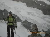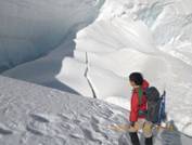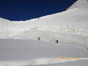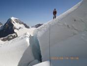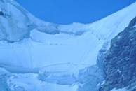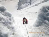 下降も岩場をコンテで降り、傾斜が弱くなった辺りで雪面に移りサクサク降りる。急な雪壁はバックで降りるが長い。ノーマルルートへの分岐に出るが眼下に巨大なセラックとクレバスが大きな口を開けている。足の長い男性が助走をつけて180°開脚して超えている、私には絶対無理。周囲を必死で見渡しクレバスが狭くなった箇所を見つけたのでそちらから巻く。