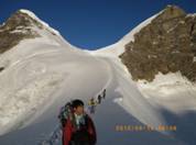 朝食(3:30) ヒュッテ(4:20) ユングフラウ頂上4158m(8:50) 下山(9:10) ヨッホ駅3454m(11:10~13:35) アイガーグレッチャー駅2320m(14:10) マルピグレン駅1616m(16:30) グリンテルワルド1034m(17:00)