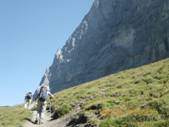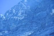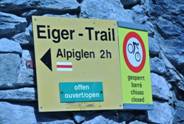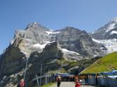 ミディ展望台は登攀関係の展示が中心だったが、ユングフラウヨッホは氷の展示が有名。今年は登山電車開通100周年を迎え、施設も新設され賑やか。ただ観光客の多くは中国人がほとんどで、一瞬ここはどこ?と思わせる。ホテルなどに掲げてある国旗はスイス・ドイツ・イタリア・フランス・オーストリアなどと日の丸もあるが、いずれ中国の国旗も加わる日がくるのか。柴谷さんに勧められた、アイガートレイルに行くためアイガーグレッチャー駅で下車、アイガーの裾を歩く。アイガー北壁を右手に西端から東端まで見続けながら歩く。壁にぽつんと見える登山電車の窓や、パラグライダーがアイガーを遊覧するのを眺めたりで飽きない。