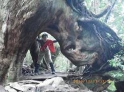 見どころの杉、一つ目は『三大杉』。伐採跡に着床し育つという切株更新により成長していくという。その後、素人目でも分かるくらい立派な杉を多く見た。次の『仁王杉』、名前の通り迫力がある。植林杉に比べ隆々としてどの杉も生命力を感じるが、名前が付けられた杉は樹齢1000年以上で直径が俄然大きく見栄えする。人と同じで見られるとより素晴らしくなるのかと思う。