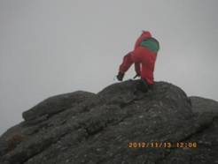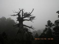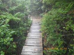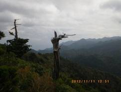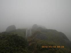 先へ進み見落としそうな栗生岳の道標に目をやると巨石の奥に小さな祠があった。次の山、翁岳は分岐を見落としたのか投石岩屋に到着。翁岳はあまり登られていないみたいだったが、巨石をロープ伝いに登るで面白そうな山だったのに残念。縦走では黒味岳も行かない人が多いようだったが、手ごろで面白そうだったのでザックをデポし往復する。屋久杉の茂る森から森林限界へと景色が変わり、ガスがなければどんなに素晴らしい眺めだったかと思う。
