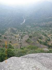 奥に進むと白谷山荘というコンクリート造りの立派な無人小屋があり、その先の辻峠へ向かう。白谷雲水峽はここまでで、ここから10分程登ると『太鼓岩』という眺めのいい大岩に上がれる。眼下には周囲の山から沢と谷が切れ込み、正面に太忠岳と花崗岩の巨石からなる『天柱石』が眺められ、その奥には海が見える。気持ち良いが風が強く、岩の傍で休憩。帰路も苔の世界を楽しむ。