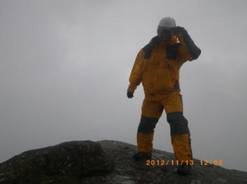 登ったり回り込んだりしながら宮之浦川の最低鞍部を渡り、直下は巨石が立ちはだかるがグイグイ登り誰も居ない頂上へ。山頂は巨石が飛び石伝いに連なっていておもしろい。景色は全く眺められず、アラレが降り風も強いので三叉路へ戻る。