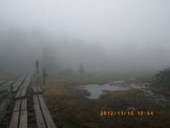 花之江河もガスに包まれ、幻想的と言えばそうも言えるが、紅葉もとぼしくちょっと寂しい。