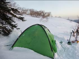 更にリフトに乗り、12時半頃に標高2,000mを出発する。位ヶ原の手前の灌木の陰にテント設営。テント内に落ち着いたのは丁度4時であった。