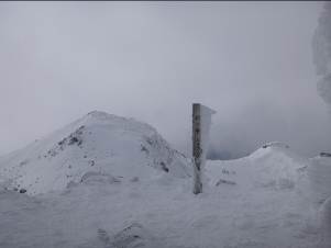 登頂直後は御嶽山も下界もはっきり見えていたが、山頂からの風景写真は無い。あれよあれよという間、感覚ではせいぜい十数秒で猛吹雪になってしまったからで、祠の中で旗を出して撮影するのが精一杯であった。