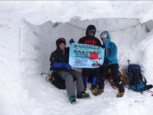次第に風も強くなってきたし雪面の踏み抜きも度々あったが、まあ難なく到着し50周年の旗を出して記念撮影する。
