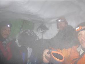 テントの蓋の調整に出ると湿った手袋が一瞬に凍った。真っ暗な急斜面、落ちたら死ぬように思い、トイレも雪洞の中で済ませようという話になる。しかし、そういう訳にもいかない大屋さんは外に出て手袋を片方吹き飛ばされたそうだ。