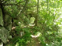 記録にあった上部の軌道跡を探そうと上部を見ていると、石垣が見える。ここから上にあがってみるとやはり軌道跡であった。さっきよりだいぶ楽に進める。