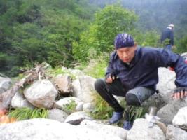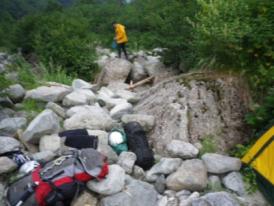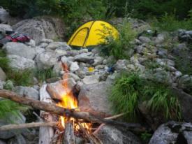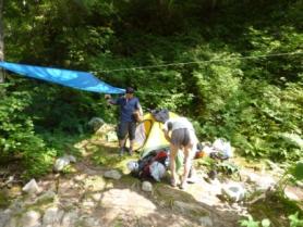 ここからは、ほとんど踏み跡程度である。途中休憩を入れながら、なんとか打込谷手前の吊り橋に到着。左岸側にいいテン場を見つけ、渡渉することに、沢靴にはきかえていると、さっきの三人パーティが、追いついてきた。このままでは、いいテン場が取られそうなので、ズボンを脱いで、パンツと沢靴で渡渉してテン場を確保。テントとタープを張り、焚火の用意をして、カンパーイ!