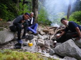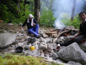 早速テントを立てて、焚火の用意をする。夕食の用意をしていると、雨が・・・。1時間程降り続く。